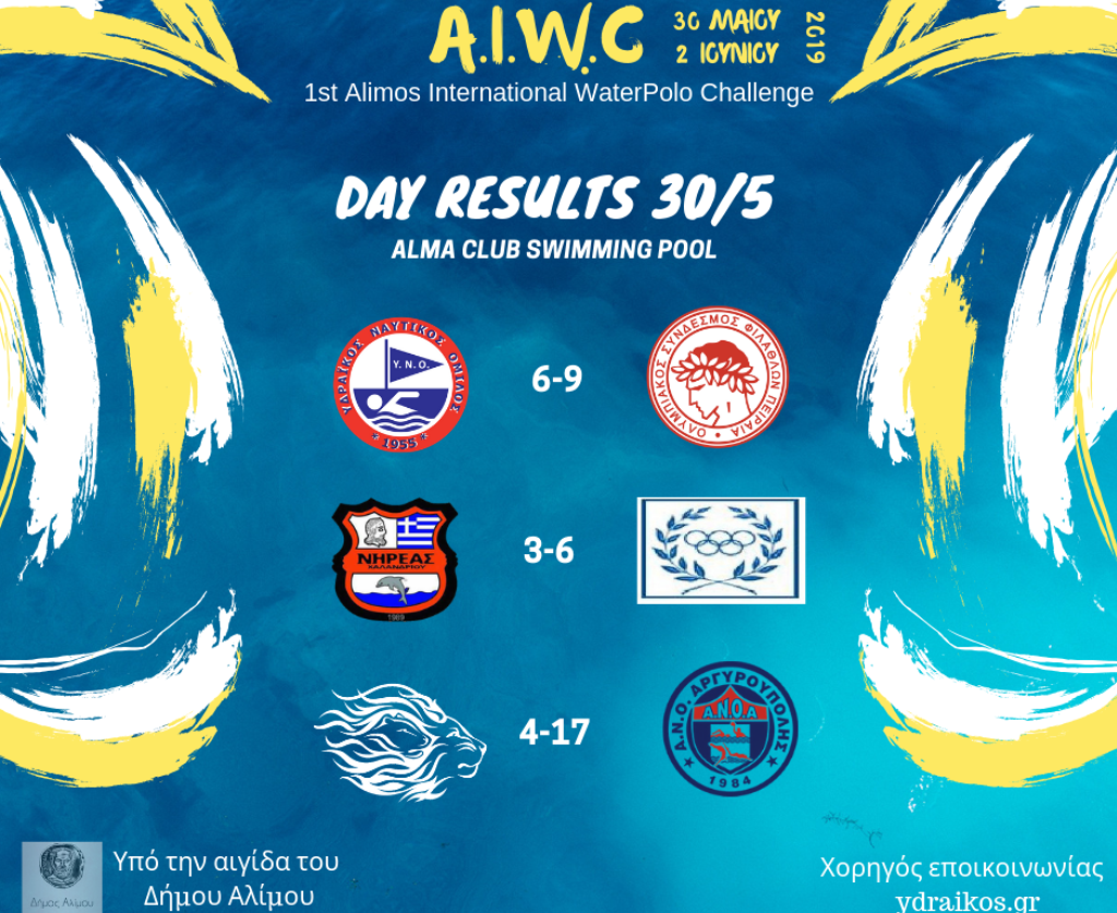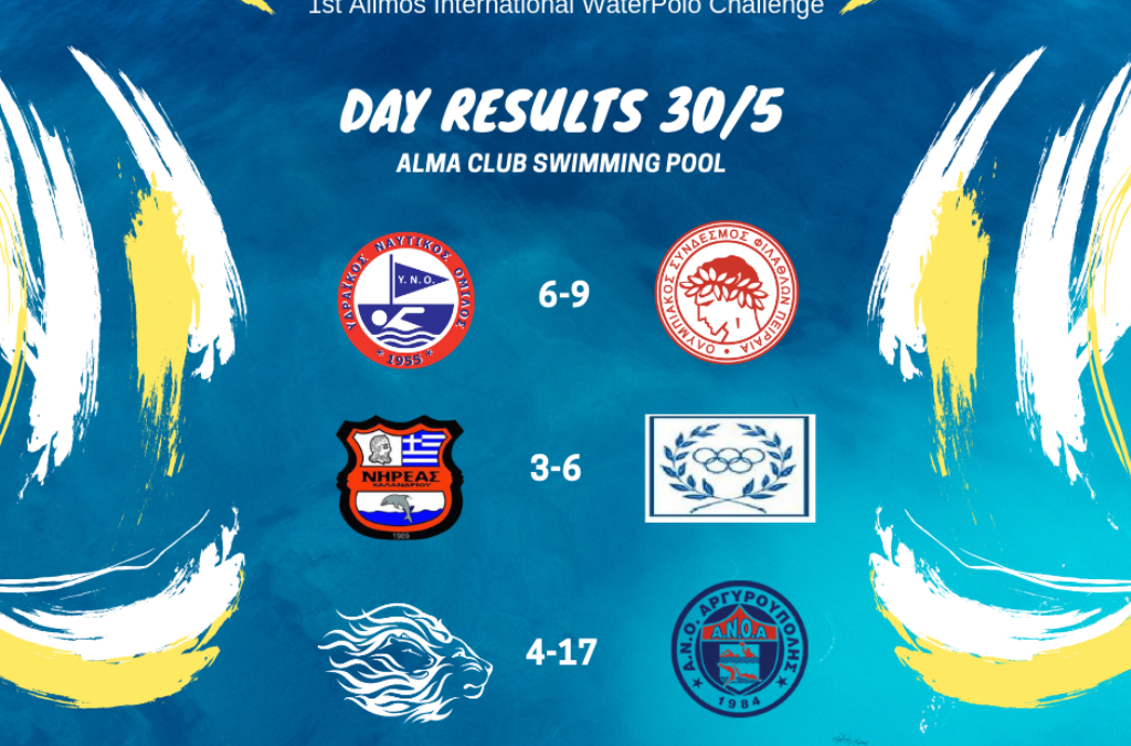 Ολοκληρώθηκε η πρώτη ημέρα του 1st Alimos International Waterpolo Challenge. Ο Ολυμπιακός νίκησε με 9-6 τον Υδραϊκό, στον αγώνα που άνοιξε την αυλαία του διεθνούς τουρνουά. Στα άλλα δύο ματς, η Ολυμπιάδα Πετρούπολης επικράτησε με 6-3 τον Νηρέα Χαλανδρίου, ενώ η Αργυρούπολη έκαμψε με 17-4 την αντίσταση των Λεόντων.